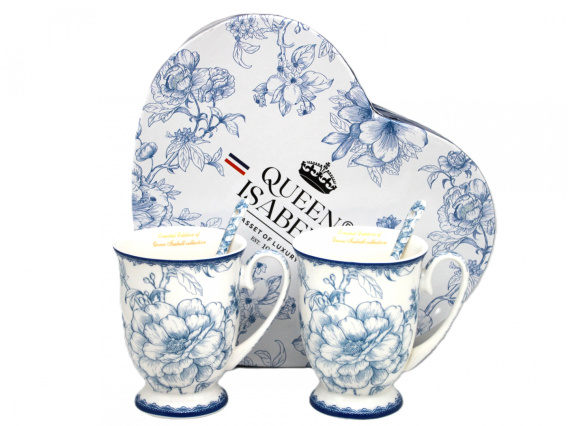 Wyjątkowy komplet dwóch kubków z łyżeczkami zdobiony motywem biało-niebieskich róż na białym tle oraz ozdobnym wzorem na rancie. Kubki z serii The England Collection z kolekcji Queen Isabell. Zestaw wykonany z wysokiej jakości białej porcelany Fine Bone. Pojemność całkowita kubka 310 ml (pojemność liczona po rant kubka). Produkt oryginalny - dopuszczony do kontaktu z żywnością