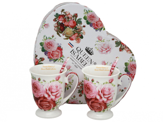 Wyjątkowy komplet dwóch kubków z łyżeczkami zdobiony motywem pięknych, dużych róż na białym tle. Kubki z serii The England Collection z kolekcji Queen Isabell. Zestaw wykonany z wysokiej jakości białej porcelany Fine Bone. Pojemność całkowita kubka 310 ml (pojemność liczona po rant kubka). Produkt oryginalny - dopuszczony do kontaktu z żywnością