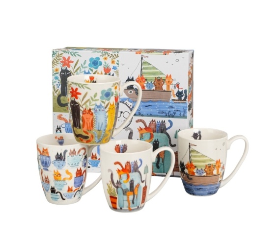 Zestaw 4 kubków classic z serii Koci Świat wchodzący w skład linii Animals. Wykonane z porcelany New Bone. Pojemność kubka 350 ml (pojemność liczona po rant kubka). Kolekcja wykonana z białej porcelany zdobionej motywami malowanych kotów w różnych sytuacjach jak: "Koty marynarze", "Koty ogrodowe", "Koty w filiżankach" czy "Koty na fotelu". Nowoczesny design oraz ciekawa kolorystyka to idealna kompozycja stworzona dla miłośników futrzastych pupili. Komplet można używać w zmywarce. Zestaw zapakowany w ozdobny kartonik.