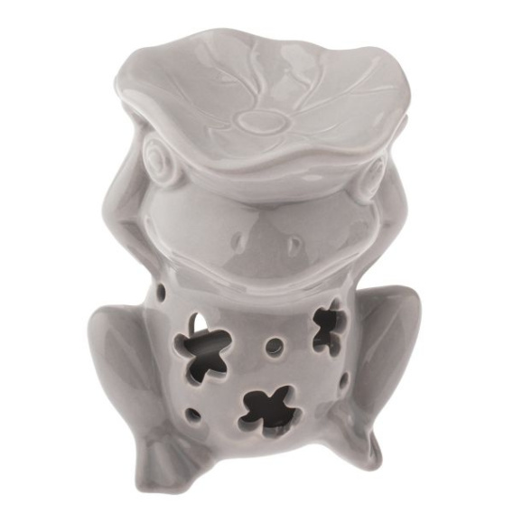 Kominek na wosk lub olejek zapachowy w kształcie żabki, wykonany z ceramiki marki Dakls. Kominek jest koloru szarego, połyskującego. Naczynie umożliwia rozpylenie zapachu wosku lub olejku zapachowego. Do użycia potrzebna jest świeczka typu tealight (brak świeczki w zestawie), którą umieszcza się w środku kominka. Wysokość kominka 12,5 cm.