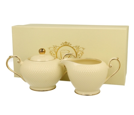 Piękna cukiernica z mlecznikiem z kolekcji Vesper z serii Ecru Exclusive. Zestaw wykonany z porcelany New Bone w kolorze śmietankowym, wykończony złotymi zdobieniami oraz tłoczeniami przypominającymi słodki wafelek. Jest to również połączenie tradycyjnego rzemiosła z nowoczesnym designem. Pojemność cukiernicy 360 ml, natomiast pojemność mlecznika 300 ml. Komplet zapakowany w ozdobny kartonik.