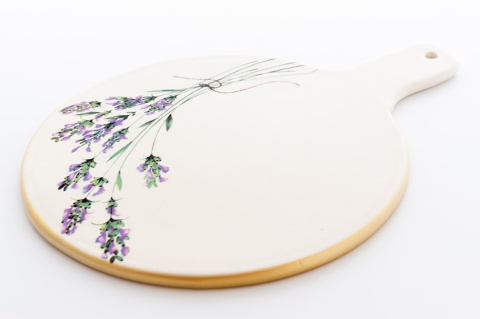 Deska w kolorze kremowym. Ozdobiona motywem lawendy. Można na niej podawać gorące potrawy bez obawy, że uszkodzi nam się blat w kuchni czy stół. Nie zajmuje dużo miejsca, dzięki czemu jest łatwa w przechowywaniu. Wykonana z użytkowej ceramiki szlachetnej. Wyprodukowany w Polsce przez fabrykę ceramiki szlachetnej w Mieroszowie. Ceramikę można myć w domowych zmywarkach oraz używać w mikrofali.