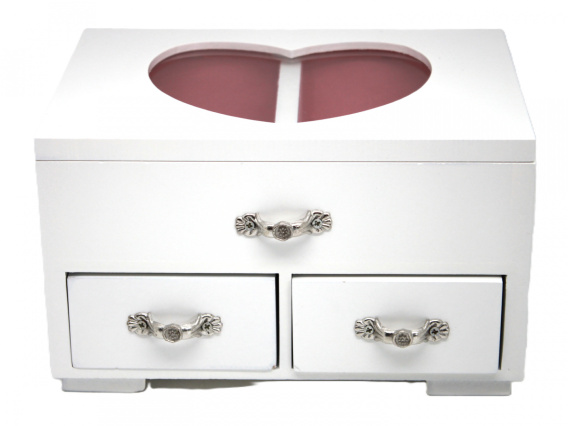 Drewniany pojemnik na biżuterię w kolorze białym z ozdobnym serduszkiem na pokrywie otwieranej na zawias. Organizer z dwoma przegródkami i dwoma szufladkami. W środku szkatułka posiada różowe, miękkie wykończenie. Wymiary szkatułki 19 cm x 14 cm x h11,5 cm.