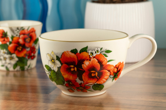 Duży kubek w kolorze kremowym. Ozdobiony motywem bratków. Wykonany z użytkowej ceramiki szlachetnej. Wyprodukowany w Polsce przez fabrykę ceramiki szlachetnej w Mieroszowie. Ceramikę można myć w domowych zmywarkach oraz używać w mikrofali.