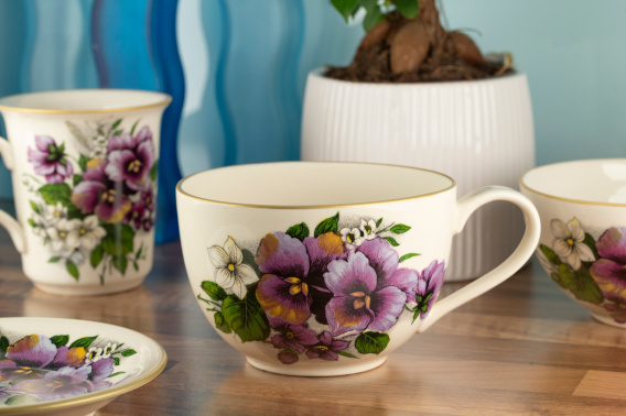 Duży kubek w kolorze kremowym. Ozdobiony motywem bratków. Wykonany z użytkowej ceramiki szlachetnej. Wyprodukowany w Polsce przez fabrykę ceramiki szlachetnej w Mieroszowie. Ceramikę można myć w domowych zmywarkach oraz używać w mikrofali.