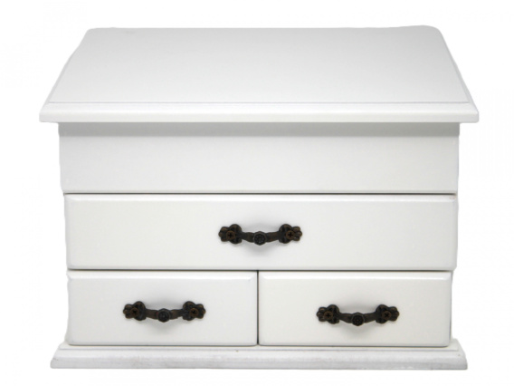 Drewniany pojemnik na biżuterię w kolorze białym z pokrywą otwieraną na zawias. Organizer z czterema przegródkami i trzema szufladkami. W środku szkatułka posiada różowe, miękkie wykończenie. Ozdobne, stalowe uchwyty do szufladek. Wymiary szkatułki 21,5 cm x 18,5 cm x h14 cm.