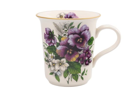Kubek w kolorze kremowym. Ozdobiony motywem bratków. Wykonany z użytkowej ceramiki szlachetnej. Wyprodukowany w Polsce przez fabrykę ceramiki szlachetnej w Mieroszowie. Ceramikę można myć w domowych zmywarkach.