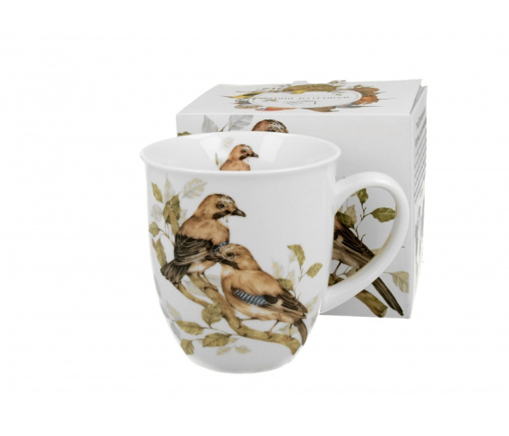 Duży, porcelanowy kubek z serii Ptasi świat Sójki zwyczajne wchodzący w skład kolekcji Animals - Ptaki. Pojemność całkowita kubka 430 ml (pojemność liczona po rant kubka). Wykonany jest z porcelany New Bone. Kolekcja zdobiona motywem leśnych sójek w delikatnych pastelowych i ciepłych brązach.