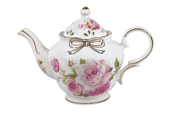 Klasyczny dzbanek z serii róża marki Fushaichi Pegasus - Japan. Dzbanek z pokrywką o pojemności 1 litra. Czajnik jest koloru białego, ozdobiony delikatnym wzorem kwitnących, różowych róż ukraińskich na białym tle. Dodatkowego uroku nadaje pokrywka z ozdobnymi wycięciami oraz złota kokarda oraz złota linia na rantach czajniczka. Imbryk wykonany został z porcelany "Fine Porcelain". Wewnątrz dzbanka, przy wylocie wody znajduje się wbudowane sitko. Czajnik zapakowany w ozdobny kartonik.