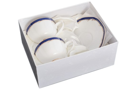 Zestaw dwóch filiżanek ze spodkami wykonanych z wysokiej jakości porcelany kostnej - niska waga i idealna biel. Filiżanki zdobione motywem niebieskiego zdobionego paska, zapakowane w prezentowe pudełko. Produkt oryginalny - dopuszczony do kontaktu z żywnością.