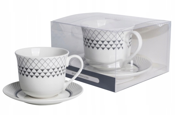 Wykonana z porcelany dobrej jakości i trwałości, zachwyca swoją czystą formą i eleganckim wzornictwem. Na jasnym, porcelanowym tle pojawia się wyrazisty czarny motyw geometryczny, który układa się w harmonijny, dekoracyjny pas. Ten nowoczesny akcent dodaje filiżance charakteru i sprawia, że prezentuje się stylowo oraz ponadczasowo.