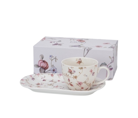 Komplet śniadaniowy składający się z filiżanki jumbo ze spodkiem Safa wchodząca w skład serii Kwiaty Classic, wykonana z porcelany New Bone. Pojemność filiżanki 440 ml (pojemność liczona po rant filiżanki). Kolekcja zdobiona niepowtarzalnym wzorem inspirowanym subtelnością natury. Kwiatuszki w pastelowych barwach różu i fioletu o delikatnych płatkach i pąkach układają się w zmysłowe, falujące linie. Zestaw charakteryzuje się pojemną filiżanką oraz dużym, podłużnym spodkiem, na którym możemy umieścić dodatkowo śniadanie czy ciasto do kawki. Można używać w zmywarce oraz kuchence mikrofalowej. Zestaw zapakowany w ozdobny kartonik.