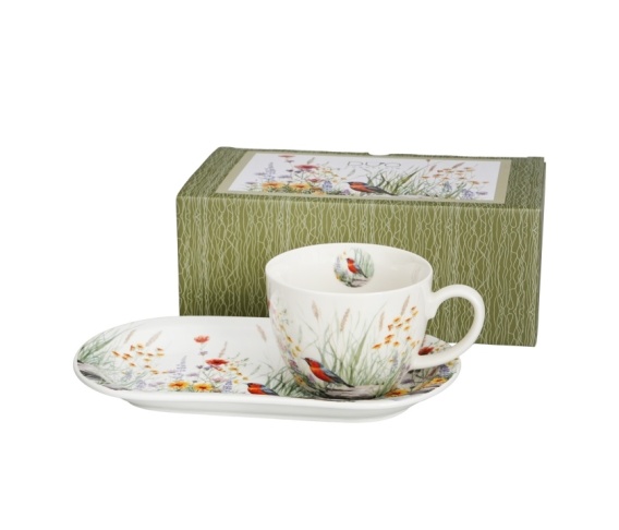 Komplet śniadaniowy składający się z filiżanki jumbo ze spodkiem July wchodząca w skład serii Kwiaty Classic, wykonana z porcelany New Bone. Pojemność filiżanki 440 ml (pojemność liczona po rant filiżanki). Kolekcja zdobiona idyllicznym motywem małego ptaszka, stojącego na kamykach przy oczku wodnym. Otoczony bujnymi przybrzeżnymi roślinami i kolorowymi kwiatami, tworzy unikalną kompozycję relaksu i harmonii z przyrodą. Zestaw charakteryzuje się pojemną filiżanką oraz dużym, podłużnym spodkiem, na którym możemy umieścić dodatkowo śniadanie czy ciasto do kawki. Można używać w zmywarce oraz kuchence mikrofalowej. Zestaw zapakowany w ozdobny kartonik.