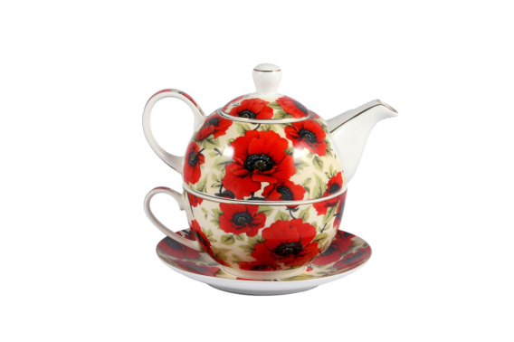 Bardzo oryginalny komplet z porcelany składający się z dzbanka, filiżanki z talerzykiem oraz sitka. Zestaw ozdobiony motywem maków. Całość zapakowana w pudełko. W trakcie parzenia herbaty dzbanek można pozostawić na filiżance aby ją ogrzać, w ten sposób herbata na dłużej pozostaje ciepła.