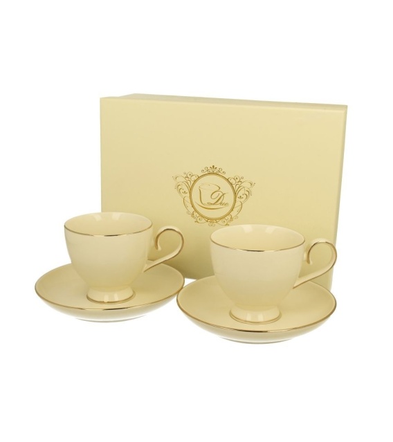 Komplet dwóch filiżanek ze spodkami z serii Victoria wchodzący w skład kolekcji Ecru Exclusive. Zestaw wykonany z porcelany New Bone w kolorze śmietankowym, wykończony eleganckimi złotymi zdobieniami na rantach oraz uszku. Doskonale gładka powierzchnia nadaje kolekcji wyjątkowej głębi i podkreśla jej klasyczny i szlachetny charakter. Komplet zapakowany w eleganckie ozdobne opakowanie. Pojemność filiżanki 320 ml (pojemność liczona po rant filiżanki). Zestaw nie nadaje się do zmywarki oraz kuchenki mikrofalowej.