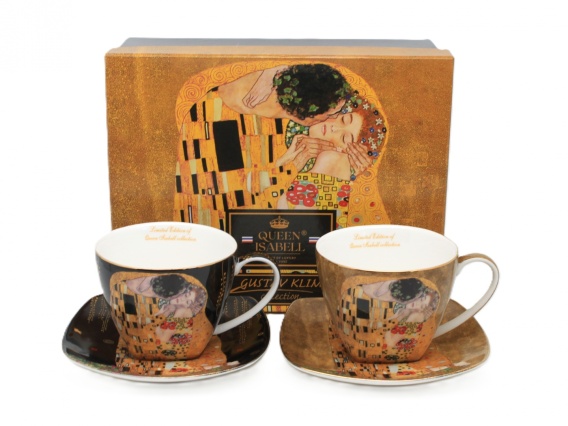 Wyjątkowy komplet dwóch filiżanek ze spodkami oraz łyżeczkami, z serii The England Collection. Zestaw z kolekcji Queen Isabell. Pojemność filiżanki 250 ml (pojemność liczona po rant filiżanki). Komplet wykonany został z wysokiej jakości białej porcelany Fine Bone, zdobionej motywem z obrazu Gustava Klimta "Pocałunek". Jedna filiżanka oraz spodek posiada czarne tło, natomiast druga złoto brązowe. Można używać w zmywarce. Zestaw zapakowany w ozdobny kartonik.