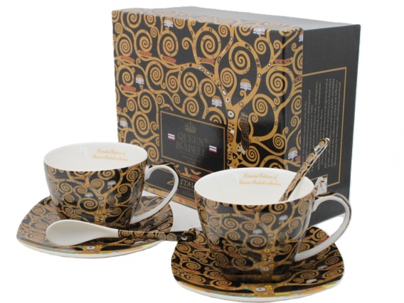 Wyjątkowy komplet dwóch filiżanek ze spodkami oraz łyżeczkami, z serii The Gustav Klimt Collection. Zestaw z kolekcji Queen Isabell. Pojemność filiżanki 250 ml (pojemność liczona po rant filiżanki). Komplet wykonany został z wysokiej jakości białej porcelany Fine Bone, zdobionej motywem z obrazu Gustava Klimta "Drzewo życia". Można używać w zmywarce. Zestaw zapakowany w ozdobny kartonik.