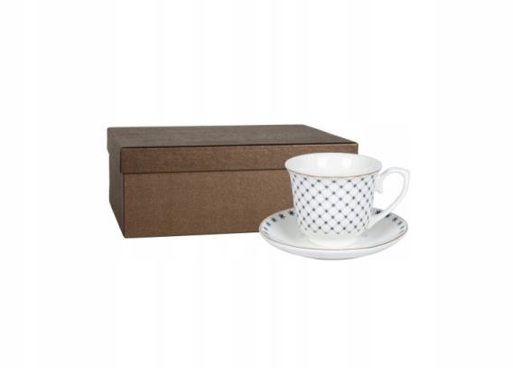 Zestaw został wykonany z dobrej jakości porcelany w subtelnym odcieniu ciepłej bieli. Filiżanki zdobi delikatny czarny ornament w formie eleganckiej kratki układającej się w geometryczny wzór, który nadaje całości wyrafinowanego charakteru i pięknie kontrastuje z jasnym tłem. Całość dopełnia złoty rant, dodający porcelanie odrobiny luksusu i podkreślający jej elegancki styl.