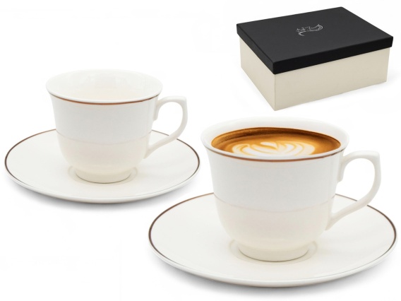 Uroczy komplet z serii Bella Fiore marki Tragar. Zestaw składa się z dwóch filiżanek oraz dwóch spodków. Pojemność całkowita filiżanki 210 ml. Białe filiżanki zdobione złotym paskiem przy górnym rancie filiżanki oraz przy rancie spodka, zostały wykonane z dobrej jakości porcelany. Zestaw zapakowany w ozdobne pudełko, świetnie nadaje się na prezent.