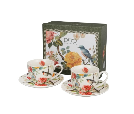 Zestaw dwóch filiżanek ze spodkami z serii April wchodzący w skład kolekcji Kwiaty Classic, wykonany z porcelany New Bone. Pojemność filiżanki 270 ml (pojemność liczona po rant filiżanki). Kolekcja zdobiona delikatnym motywem różanych krzewów w intensywnych odcieniach czerwieni, bieli i żółci. Na kwiatowe gałązki zostały subtelnie wkomponowane dwa urocze, kolorowe ptaszki, dodając całości radości i pełnego życia charakteru. Komplet można używać w zmywarce. Zestaw zapakowany w ozdobny kartonik.