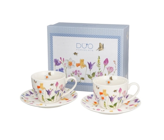 Zestaw dwóch filiżanek ze spodkami z serii May wchodzący w skład kolekcji Kwiaty Classic, wykonany z porcelany New Bone. Pojemność filiżanki 270 ml (pojemność liczona po rant filiżanki). Kolekcja zdobiona kolorowymi kwiatami takimi jak żonkile o jasnych i słonecznych odcieniach żółci i pomarańczu, fioletowe i różowe tulipany czy frezje oraz lawenda z zielonymi liśćmi tworzą harmonijną kompozycję. Motyw został ożywiony latająca pszczołą oraz delikatnym motylem. Komplet można używać w zmywarce. Zestaw zapakowany w ozdobny kartonik.