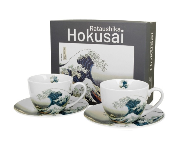 Zestaw dwóch filiżanek ze spodkami The Great Wave by K. Hokusai, wchodzący w skład linii Art Gallery, wykonany z porcelany New Bone. Pojemność filiżanki 270 ml (pojemność liczona po rant filiżanki). Kolekcja zdobiona fragmentem reprodukcji drzeworytu "Wielka Fala w Kanagawie" Hokusai Katsushika. Komplet można używać w zmywarce. Zestaw zapakowany w ozdobny kartonik.