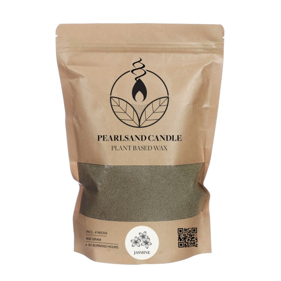 Świeca perłowa w granulacie, stearyna jasno-zielona o zapachu jaśminu (jasmine) - jaśmin pachnie słodko, upojnie, intensywnie. Roślinny wosk w formie kuleczek. Jest to naturalny wosk pochodzenia roślinnego, zapakowany w opakowanie o gramaturze 400 gramów, które zawiera również 4 bawełniane knotki do samodzielnego tworzenia świec.