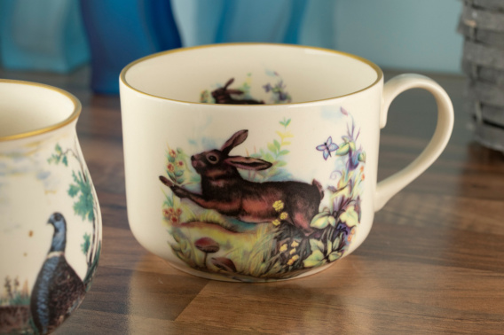 Kubek w kolorze kremowym. Ozdobiony motywem kuropatwy. Wykonany z użytkowej ceramiki szlachetnej. Wyprodukowany w Polsce przez fabrykę ceramiki szlachetnej w Mieroszowie. Ceramikę można myć w domowych zmywarkach oraz używać w mikrofali.
