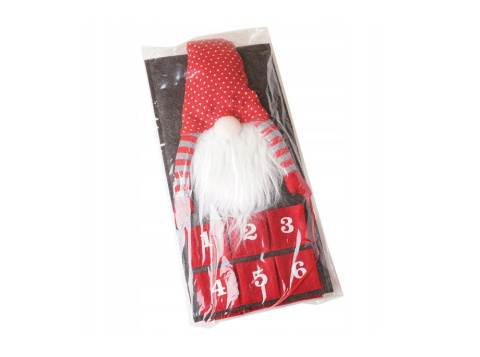 Wyjątkowy kalendarz adwentowy wykonany z materiału tzw. filcu w kształcie krasnala. Posiada 24 kieszonki w których można umieścić np. słodycze, czy inne drobiazgi. Doskonały na prezent dla Twojej pociechy. Skrzat posiada wstążkę za którą można go powiesić.