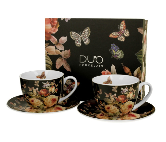 Komplet dwóch filiżanek 250 ml (po brzeg 300 ml) ze spodkami WARDA wchodzący w skład serii FIVE O'CLOCK wykonany z porcelany New Bone China, charakteryzującej się elegancką i naturalną kremowo - białą barwą z delikatnym połyskiem, a także wyjątkową wytrzymałością. Linia charakteryzuje się wyrazistym motywem herbacianych róż w ciepłych kolorach na intensywnie czarnym tle.