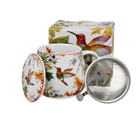 Kubek LINNEA w kształcie baryłki, z zaparzaczem i pokrywką, wchodzący w skład serii Secret Garden. Kubas wraz z pokrywką wykonane zostały z porcelany New Bone China. Pojemność kubka 460 ml (pojemność liczona po rant kubka). Kolekcja zdobiona motywem malowanych kwiatów w wyrazistych kolorach oraz uroczego kolibra.