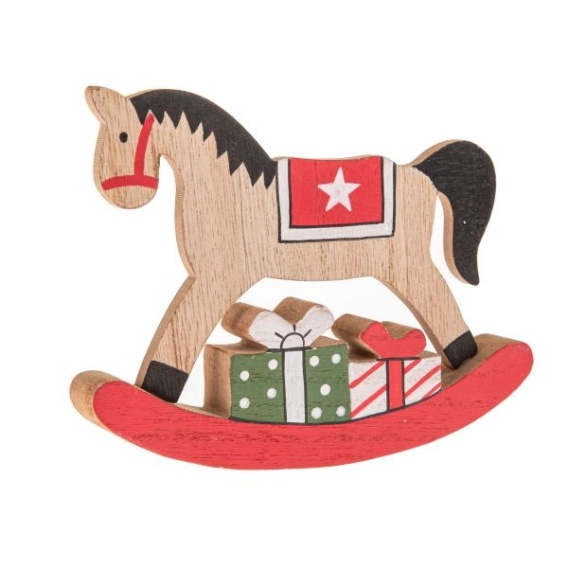 Drewniany koń na biegunach jako świąteczny wystrój wnętrza marki Dakls. Figurka jest koloru beżowo brązowego z czerwonym siodłem. Koń ustawiony jest na drewnianej, czerwonej, wygiętej płozie dzięki czemu wykonuje ruch bujania. Na płozie znajdują się dwa prezenty. Figurkę możemy postawić w dowolnie wybranym przez nas miejscu. Całość tworzy uroczą świąteczną dekorację. Wysokość figurki 11,5 cm.