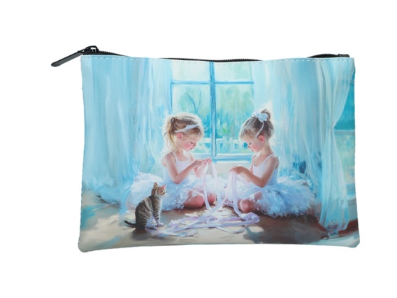 Kosmetyczka z serii malarstwo marki Carmani. Na kosmetyczce widnieje zachwycający motyw z obrazu Laury Lozano "Małe baletnice" podczas ćwiczeń na niebieskim tle. Pięknie ozdobiona i bezpieczna bo zamykana na suwak kosmetyczka, która pomieści kosmetyki do makijażu, dokumenty. Można ją także wykorzystać do dyskretnego przechowywania damskich skarbów. Materiał użyty do wykonania kosmetyczki to imitacja skóry z podszewką. Wymiary 22 cm x 15 cm. Kosmetyczka zapakowana jest w celofan.