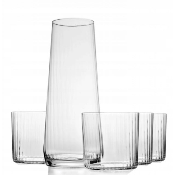 Najbardziej charakterystycznym elementem zestawu jest subtelne pionowe karbowanie. To właśnie ono sprawia, że światło miękko rozprasza się na powierzchni szkła, a karafka i szklanki wyglądają elegancko zarówno na codziennym stole, jak i podczas spotkań z gośćmi. To design, który nie potrzebuje ozdobników – przyciąga spojrzenia swoją prostotą.