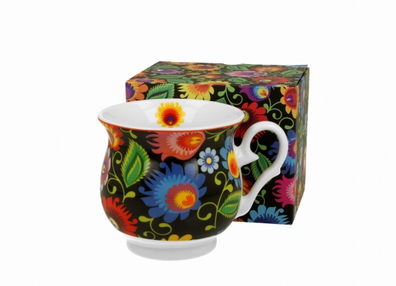 Wykonany z porcelany New Bone, zachwyca intensywnym czarnym tłem ozdobionym kolorowymi, regionalnymi wycinankami – pełnymi kwiatów, liści i pawich oczek. Śnieżnobiały środek kontrastuje z barwnym wzorem, czyniąc każdy łyk jeszcze przyjemniejszym.
