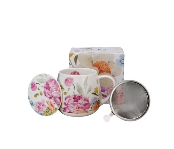 Kubek baryłka z serii June, ze stalowym zaparzaczem i pokrywką, wchodzący w skład linii Kwiaty Classic. Pojemność kubka 430 ml (pojemność liczona po rant kubka). Kolekcja wykonana z białej porcelany New Bone, zdobiona motywem fantazyjnej kompozycji kwiatowej. Intensywny róż kwiatów w połączeniu z pastelowymi liśćmi oraz wplecionymi we wzór subtelnymi kwiatuszkami, tworzy elegancką ale jednocześnie dynamiczną całość. Można używać w zmywarce oraz kuchence mikrofalowej. Zestaw zapakowany w ozdobny kartonik.