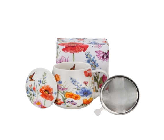 Kubek baryłka z serii Spring, ze stalowym zaparzaczem i pokrywką, wchodzący w skład linii Kwiaty Classic. Pojemność kubka 430 ml (pojemność liczona po rant kubka). Kolekcja wykonana z białej porcelany New Bone, zdobiona kolorowymi kwiatami takimi jak czerwono-pomarańczowe tulipany i maki, intensywnie niebieskie chabry i gałązki łubinu przeplatające się z różowymi powojnikami. Motyw został ożywiony kolorowymi i delikatnymi motylami. Można używać w zmywarce oraz kuchence mikrofalowej. Zestaw zapakowany w ozdobny kartonik.