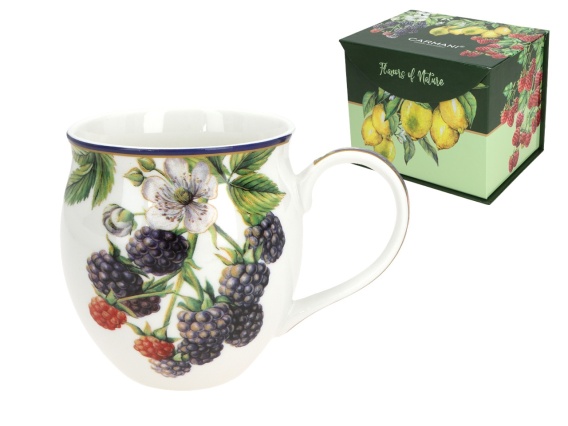 Duży kubek w kształcie beczułki z porcelany bardzo dobrej jakości - idealna biel oraz duża wytrzymałość marki Carmani. Kubek o pojemności 470 ml (pojemność liczona po rant kubka) z kolekcji Flavors of nature - Jeżyny. Na kubku widnieje motyw owoców jeżyny rosnących na gałązce z kwiatami na białym tle. Kubek z granatowo-złotym, górnym rantem oraz kwiatowo-owocowym zdobieniem na uszku uroczo prezentują się na stole i nie tylko. Można używać w zmywarce. Kubek jest starannie zapakowany w eleganckie pudełko z magnetycznym zapięciem.