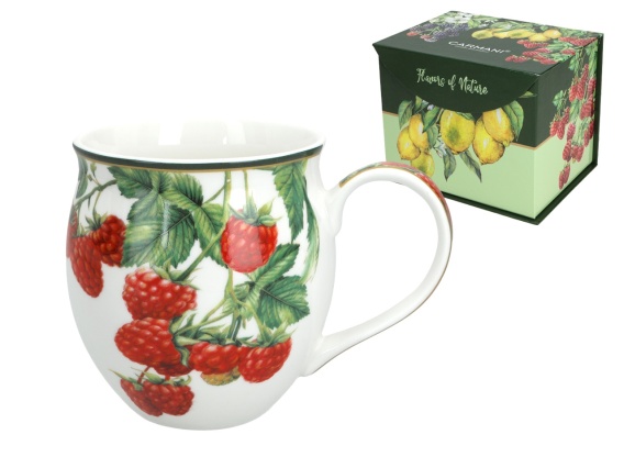 Duży kubek w kształcie beczułki z porcelany bardzo dobrej jakości - idealna biel oraz duża wytrzymałość marki Carmani. Kubek o pojemności 470 ml (pojemność liczona po rant kubka) z kolekcji Flavors of nature - Maliny. Na kubku widnieje motyw soczyście czerwonych owoców malin rosnących na gałązce na białym tle. Kubek z zielono-złotym, górnym rantem oraz owocowym zdobieniem na uszku uroczo prezentują się na stole i nie tylko. Można używać w zmywarce. Kubek jest starannie zapakowany w eleganckie pudełko z magnetycznym zapięciem.