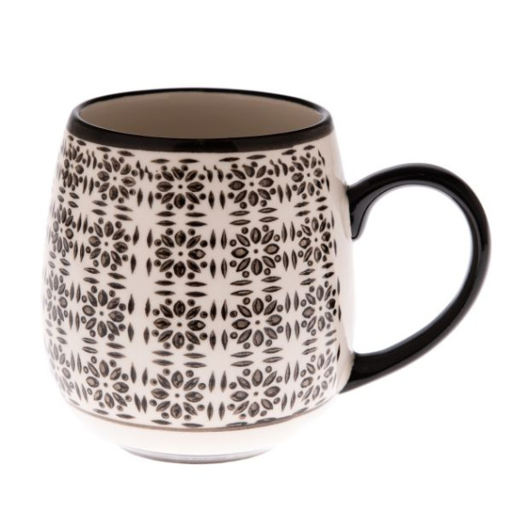 Kubek w kształcie beczułka o pojemności 390 ml (pojemność liczona po rant kubka) wykonany z ceramiki, charakteryzujący się naturalnym kremowo-białym kolorem z delikatnym połyskiem. Linia zdobiona motywem marokańskim. Wzór na kubeczku jest koloru czarnego. Piękny marokański wzór na kubku pozwoli Ci na chwilę przenieść się myślami do afrykańskich klimatów i pozwoli delektować się Twoim ulubionym napojem.