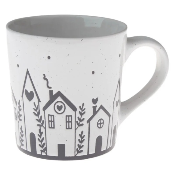 Duży kubek o pojemności 510 ml (pojemność liczona po rant kubka) wykonany z ceramiki, marki Dakls. Linia zdobiona motywem wytłaczanych, czarnych domków na białym błyszczącym tle - tło delikatnie nakrapiane czarnymi kropeczkami. Można używać w zmywarce oraz kuchence mikrofalowej.
