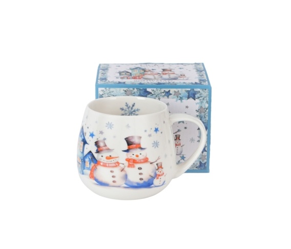 Kubek baryłka Snowman wchodzący w skład serii Świątecznej, wykonany z porcelany New Bone. Pojemność kubka 430 ml (pojemność liczona po rant kubka). Kolekcja wykonana z białej porcelany zdobiona motywem wesołej rodziny bałwanków na tle malowanych domków w pastelowych odcieniach błękitu i niebieskiego. Zimowy krajobraz uzupełniony o świąteczne detale doskonale wprowadza w bożonarodzeniowy nastrój. Można używać w zmywarce oraz kuchence mikrofalowej. Kubek zapakowany w ozdobny kartonik.
