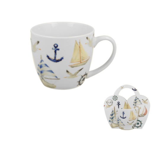 Kubek z serii Żaglówki z kolekcji Seaside marki Duo. Pojemność całkowita kubka 460 ml (pojemność liczona po rant kubka). Wykonany jest z porcelany New Bone. Kolekcja utrzymana w marynistycznym klimacie gdzie dominują takie elementy jak żaglówki, koło sterowe i kotwica a pomiędzy nimi unoszą się białe mewy. Można używać w zmywarce oraz kuchence mikrofalowej. Kubek zapakowany w ozdobny blister z uchwytami, zdobiony tym samym uroczym motywem, doskonały na prezent.