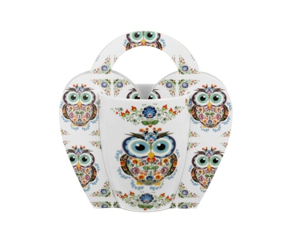 Kubek z serii Sowa Etno marki Duo zapakowany w ozdobnym "koszyczku". Pojemność całkowita kubka 350 ml (pojemność liczona po rant kubka). Wykonany jest z porcelany New Bone. Kolekcja zdobiona motywem uroczej sowy wykonanej z etnicznych wycinanek. Intensywne kolory na idealnie białym tle tworzą harmonijną całość. Można go swobodnie myć w zmywarce oraz używać w kuchence mikrofalowej.