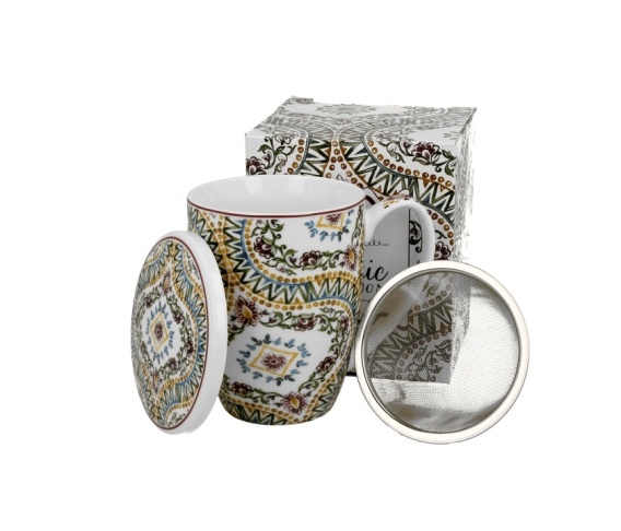 Kubek z pokrywką oraz stalowym zaparzaczem Estrella wchodzący w skład serii Ethnic, wykonany z porcelany New Bone. Pojemność kubka 380 ml (pojemność liczona po rant kubka). Doskonały do przyrządzania ulubionej herbaty i aromatycznych ziół. Kolekcja zdobiona abstrakcyjnym spiralnym motywem, otoczonym delikatnymi, fioletowymi kwiatuszkami, tworząc harmonijną kompozycję inspirowaną etnicznym designem. Można używać w zmywarce oraz kuchence mikrofalowej. Zestaw zapakowany w ozdobny kartonik.