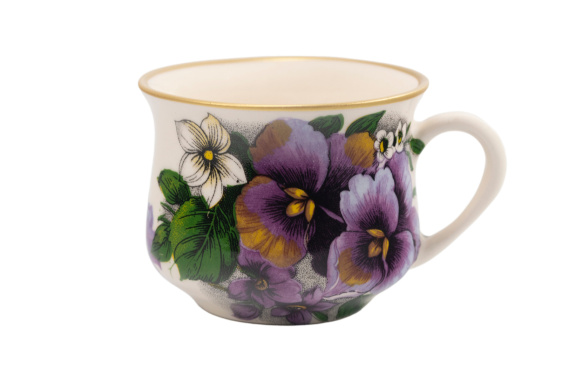 Kubek w kolorze kremowym. Ozdobiony motywem bratków. Wykonany z użytkowej ceramiki szlachetnej. Wyprodukowany w Polsce przez fabrykę ceramiki szlachetnej w Mieroszowie. Ceramikę można myć w domowych zmywarkach oraz używać w mikrofali.