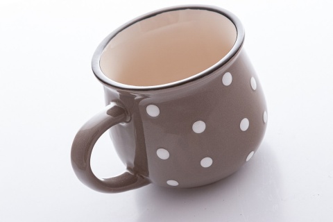 Beczułkowaty kubek w kolorze szarym w kropki wykonany z ceramiki.