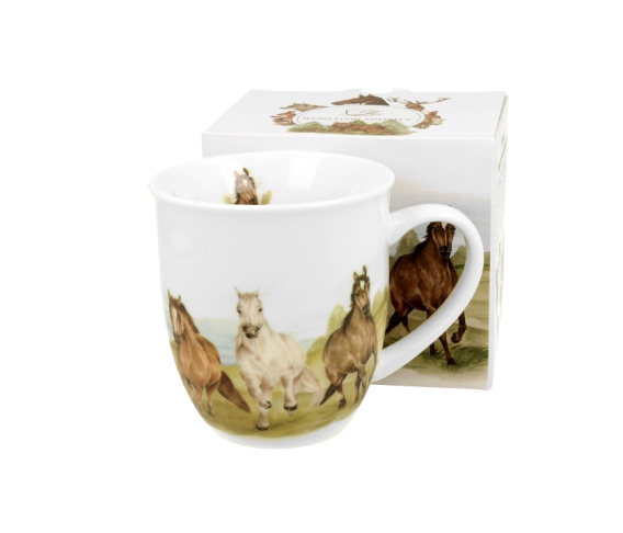Duży, porcelanowy kubek z serii Świat Zwierząt Konie w Galopie wchodzący w skład kolekcji Animals. Pojemność całkowita kubka 430 ml (pojemność liczona po rant kubka). Wykonany jest z porcelany New Bone. Kolekcja zdobiona dynamicznym wzorem trzech majestatycznych koni galopujących po otwartej przestrzeni łąki.