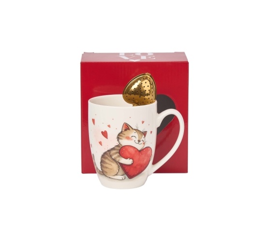 Kubek ze stalowym zaparzaczem Kot z zabawką wchodzący w skład serii Serca, wykonany z porcelany New Bone. Pojemność kubka 400 ml (pojemność liczona po rant kubka). Złoty zaparzacz w kształcie serca, doskonały do przyrządzania ulubionej herbaty i aromatycznych ziół. Kolekcja zdobiona motywem uroczego kotka, który w łapkach ściska ogromne czerwone serce. Kubek można używać w zmywarce oraz kuchence mikrofalowej. Zestaw zapakowany w ozdobny kartonik z okienkiem, na którym zostało umieszczone miejsc na napisanie, krótkiej notatki od kogo i dla kogo jest ten kubeczek. Idealny na prezent np. z okazji Walentynek.