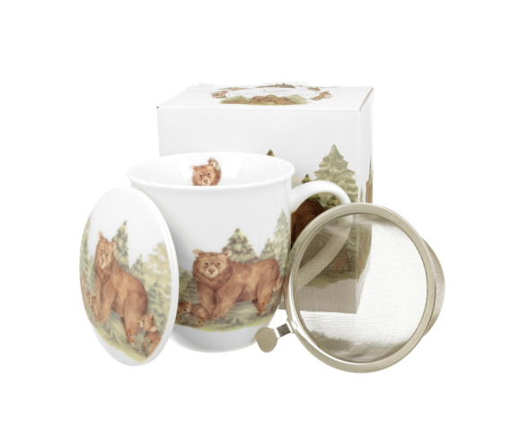Komplet dużego, porcelanowego kubek wraz z zaparzaczem oraz przykrywką z serii Świat Zwierząt Niedźwiedzie wchodzący w skład kolekcji Animals. Pojemność całkowita kubka 430 ml (pojemność liczona po rant kubka). Zestaw wykonany jest z porcelany New Bone, natomiast sitko ze stali nierdzewnej. Kolekcja zdobiona urokliwym motywem, przedstawiającym rodzinę niedźwiedzi w ich naturalnym środowisku.